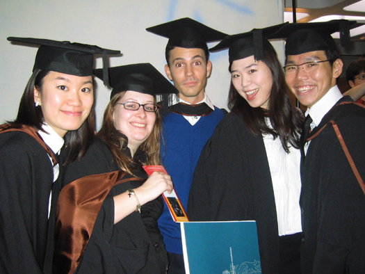 Five of our finest graduates (MA CCI, 2005-6) are pictured here, berobed and bemortared, if that’s the right word, just after this year’s ceremony at London’s Barbican Centre. They are (L-R) Tae-Eun Kim, Chloe Preece, Victor Orive-Martin, Jihee Kim and Eugene Ng.