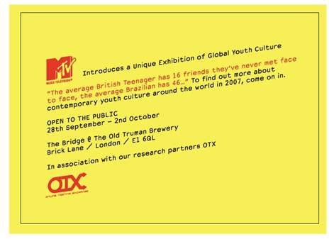 October 1, 2007November 18, 2020 cmcikings Teenage clicks A friend of Lost in CCI‘s is involved in this MTV event at the Old Truman Brewery, open until tomorrow. Don’t miss it! Share this: Click to share on X (Opens in new window) X Click to share on Facebook (Opens in new window) Facebook Like Loading... Related