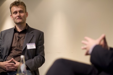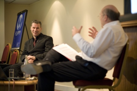 Other highlights of the day included a talk from the sociologist Professor Frank Furedi, who pointed out the extent of the media’s dependence on stories about new research (for example in medicine and social science). There were also entertaining interviews with the film critic Mark Kermode (who holds a PhD and is visiting lecturer at Southampton University), and the Cambridge-educated comedian Hugh Dennis. Kermode (top) and Dennis (bottom) are pictured being interviewed below.