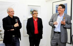 CMCI’s Dr Richard Howells has had the unusual experience of being invited to open an art exhibition. He responded with “a few well-chosen words” at the private view of the Leamington Studio Artists 2010 Summer Exhibition. The show was organised by the sociologist Gordon Fyffe, a good friend to CMCI, and Richard (pictured on the right of the group photo) was delighted to follow in the distinguished footsteps of screenwriter Andrew Davies, who did the previous year’s opening. Richard shamelessly dropped the names of Tracey Emin and David Hockney while also making some more serious points about the relationship between art theory and the practice of studio art.