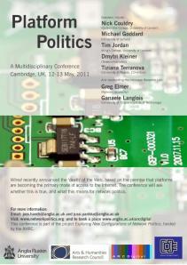 Platform Politics is a conference exploring the meaning of platforms–like the Internet, the Web, the iPad and more–and their politics. Dr Tim Jordan from CMCI is a keynote speaker at this conference and will be exploring the nature of platforms as politics in relation to Google, secure information network TOR, OpenLeaks and other elements of a politics of platforms. He will be speaking alongside an international list of speakers including: Dr Tiziana Terranova, University of Naples; Professor Nick Couldry Goldsmiths Collge; Dmytri Kleiner (Telekommunisten); and the Infoscape Research Lab (Greg Elmer, Ryerson University and Ganaele Langlois University of Ontario Institute of Technology)