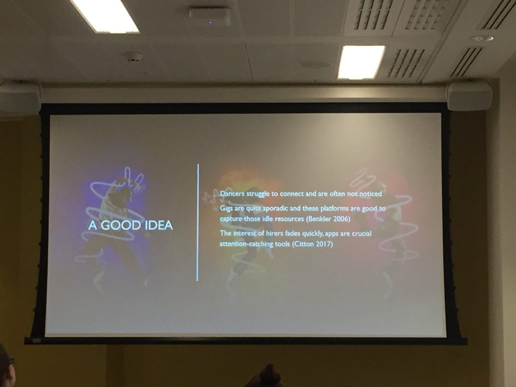 Because of the inter-disciplinary nature of my research in CMCI, my findings on the field have taken me in different directions. Even from the early stages, many dancers were able to connect through me, develop and cross-fertilise their business/teaching strategies just by communicating their diverse approaches. While analysing my data, I was also increasingly made aware that one of the biggest problems of the industry orbits around the absence of working standards and unionisation. Thanks to this I have got to know many inspiring and interesting people working on similar issues not uncommon in other dance styles like commercial. Additionally, and partially inspired by my teaching role at the Department of Digital Humanities, I developed an interesting practice-oriented idea of developing “An Uber for Dancers”, which was presented at CMCI Emerging Voices and is currently work in progress in academic, pragmatic, and ethical terms. Finally, beyond the PhD, my project might present a detailed and accurate landscape, and kinetoscape, of the practice of popular dance, which can be applied both in terms of formalisation of the practice and empowerment of its practitioners.