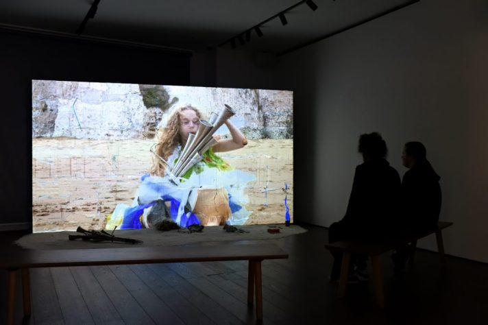 I had originally conceived the film to be projected onto a flat surface. But in the weeks leading up to the exhibition, I decided to apply a technique from a previous work, where I had projected onto a cardboard sculpture. This enabled an additional material and conceptual connection in the work. The screen was transformed into a sculpture.
