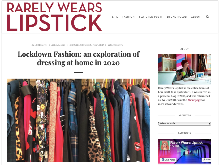 As a fashion sociologist, I have always been fascinated by everyday sartorial behaviours as a mechanism that allows to ‘articulate the relationship between a particular body and its lived milieu, the space occupied by bodies and constituted by bodily actions’, as fashion theorist Jennifer Craik put it. But what happens to dress in a world where the ‘lived milieu’ is drastically altered and where ‘bodily actions’ are no longer the familiar, repetitive rituals they had always been? In other words, what happens to our sartorial practices during quarantine? And what can it tell us about emerging forms of sociality in an era of social distancing; about how we negotiate the boundaries between private and public when they are no longer explicitly configured in space? To find out, my friend Lorraine (Lori) Smith and I started a project called Lockdown Fashion (which is probably a misnomer – more on it below) where we ask people to reflect on how the quarantine has affected the way they dress.