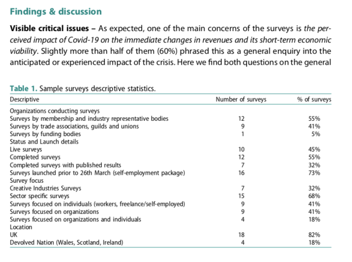 The precarious nature of creative and cultural work is widely acknowledged in academic literature. However, it has often been invisible in the eyes of policy and policymaking. As soon as the spread of Covid-19 started impacting local and national economies across the globe, many industry and policy bodies rushed into researching the impact of Covid-19 on the creative and cultural industries (CCIs) and the workers in the sector. The paper offers an insight into the key concerns of these organizations through the meta-analysis of the survey and research projects that are currently being undertaken in the context of the UK. The results highlight common concerns in relation to visible and invisible issues that need addressing in the sector. The paper concludes by questioning if Covid-19 represents a moment of crisis for the sector or has simply exposed the unsustainable price of creative and cultural work.