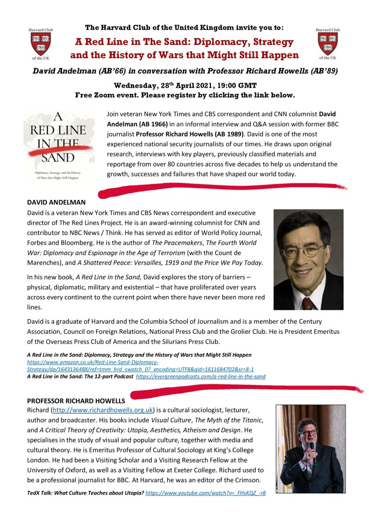 CMCI Emeritus Professor Richard Howells conducted an online interview with New York Times and CBS correspondent David A Andelman. It began with questions about his new book: A Red Line in the Sand: Diplomacy, Strategy, and the History of Wars that Might Still Happen, before the conversation expanded to current events. Questions from the audience followed.