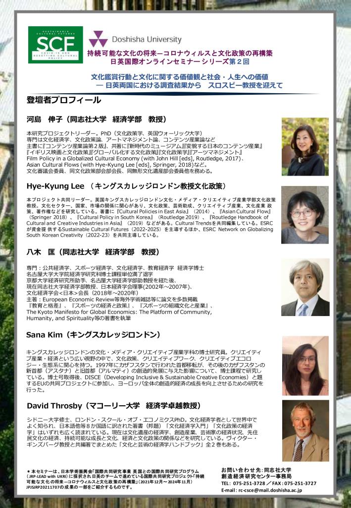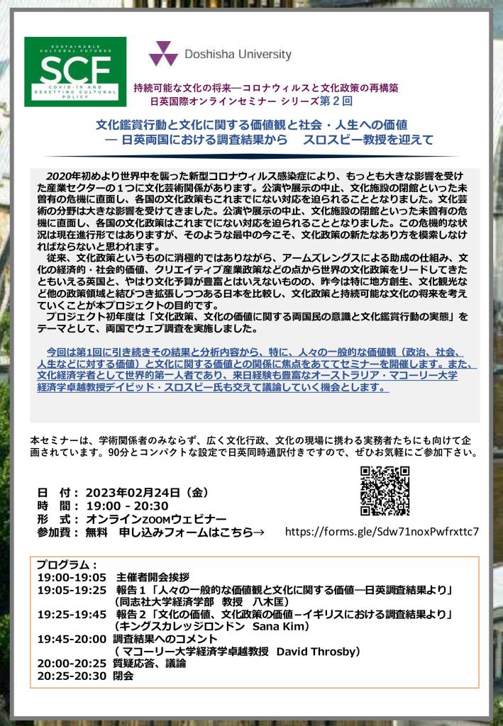 We are pleased to invite you to an online seminar on cultural value and public perception of cultural policy in the UK and Japan. This seminar will discuss key findings from two public opinion surveys carried out in the two countries in the summer of 2022. The surveys were part of the UKRI-JSPS Sustainable Cultural Futures project, the first major UK-Japan research collaboration in cultural policy (2022-2025). They had questions on cultural engagement, the public’s understanding of cultural policy and funding, their recognition of cultural value and their social participation and happiness. Our previous seminar (December 2022) looked at the key findings of cultural engagement. In this seminar, we will focus on the public’s view of cultural value and cultural policy in the UK (England) and the analysis of cultural value judgement in Japan. The whole seminar will be simultaneously translated from English/Japanese to Japanese/English. This event is supported by the Economic and Social Research Council via the Fund for International Collaboration [Grant Ref: ES/W011891/1].