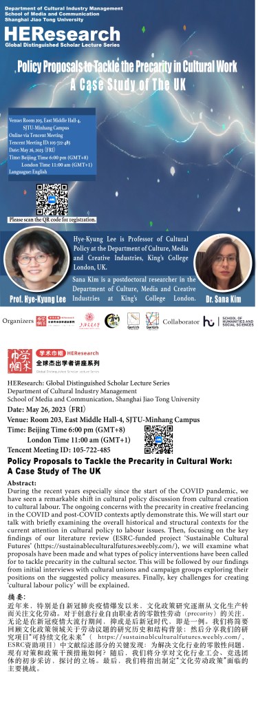 Join Professor Hye-Kyung Lee and Dr. Sana Kim for a discussion on precarity in cultural work on the 26th May 2023.