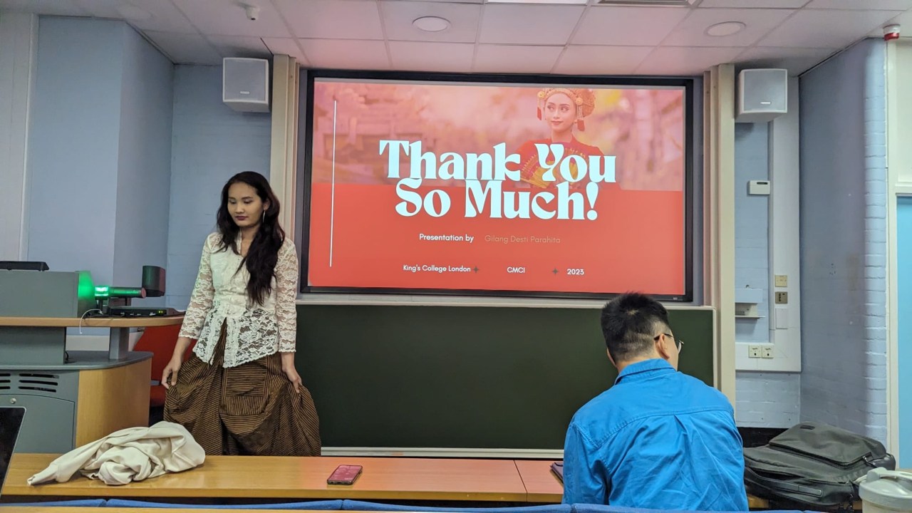 I was pleased to be allowed to present my research project to the staff and students last week. In the opportunity, I received more diverse feedback and exciting questions about the Balinese kebaya (the white blouse) and Javanese Lurik (the skirt) I wore. I wore traditional Indonesian clothing to show that Indonesia is diverse, and women’s bodies, regarding what clothes to wear, also become an arena for discourse and norms contestation. I also want to introduce one of the largest archipelagic countries in Southeast Asia to the King’s College London campus audience.